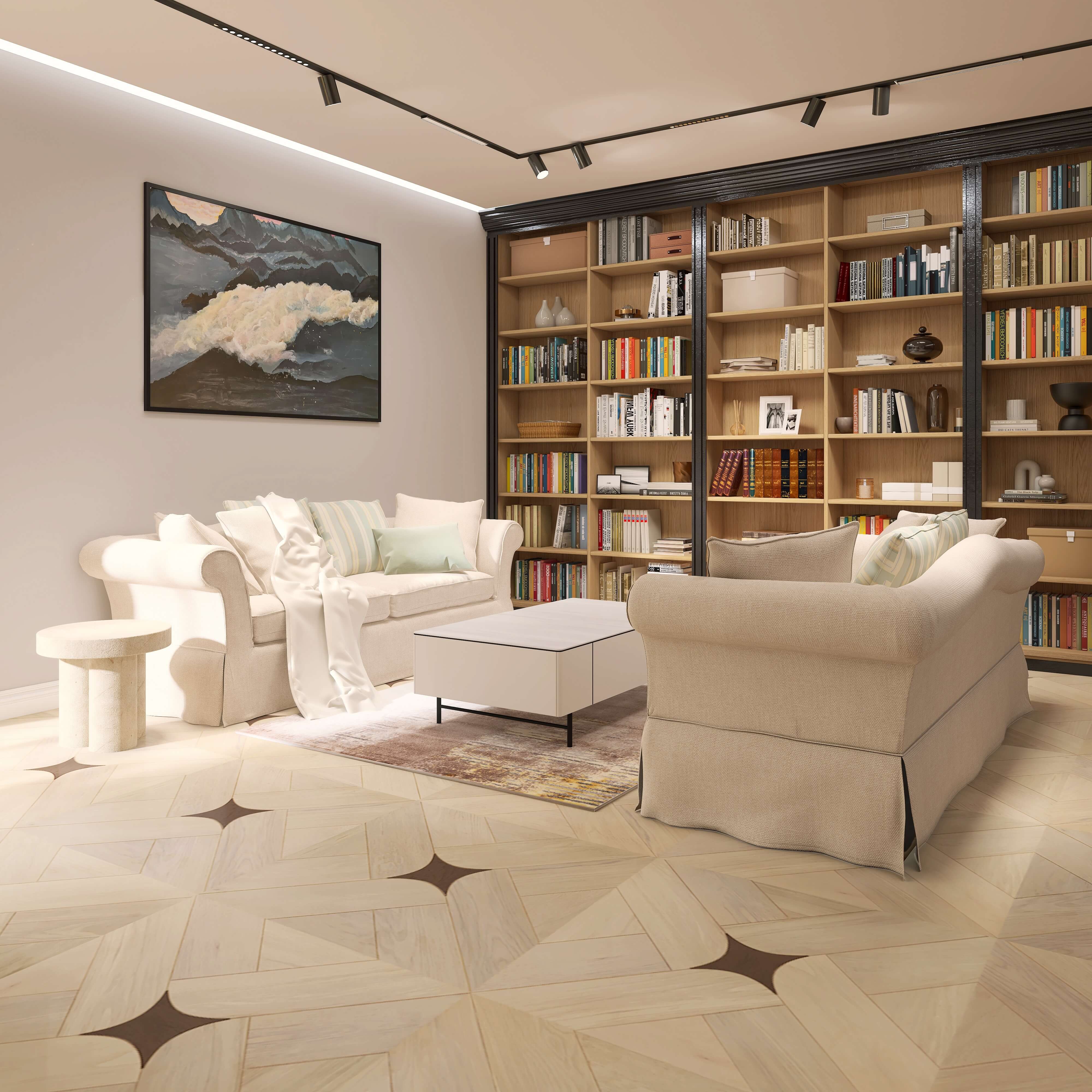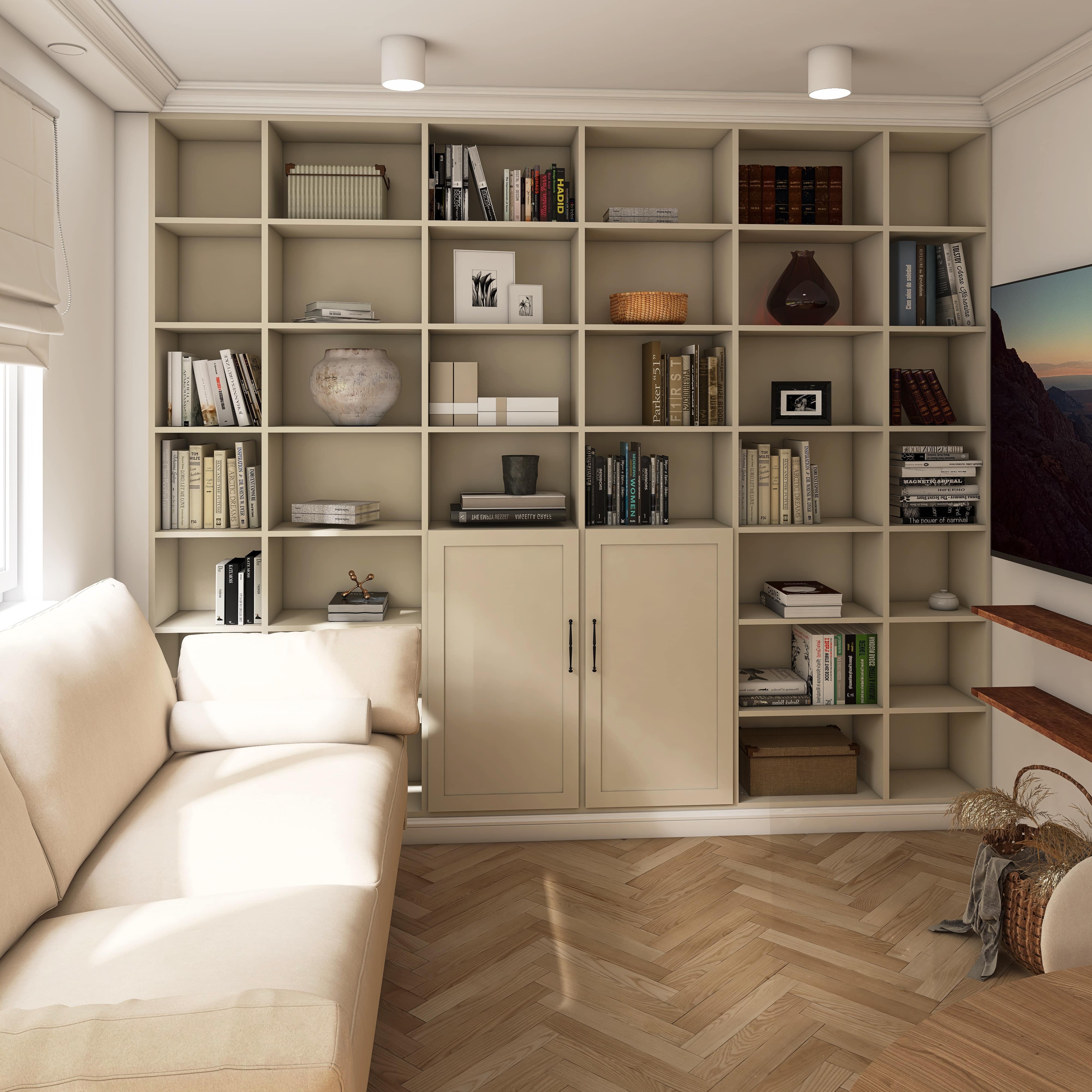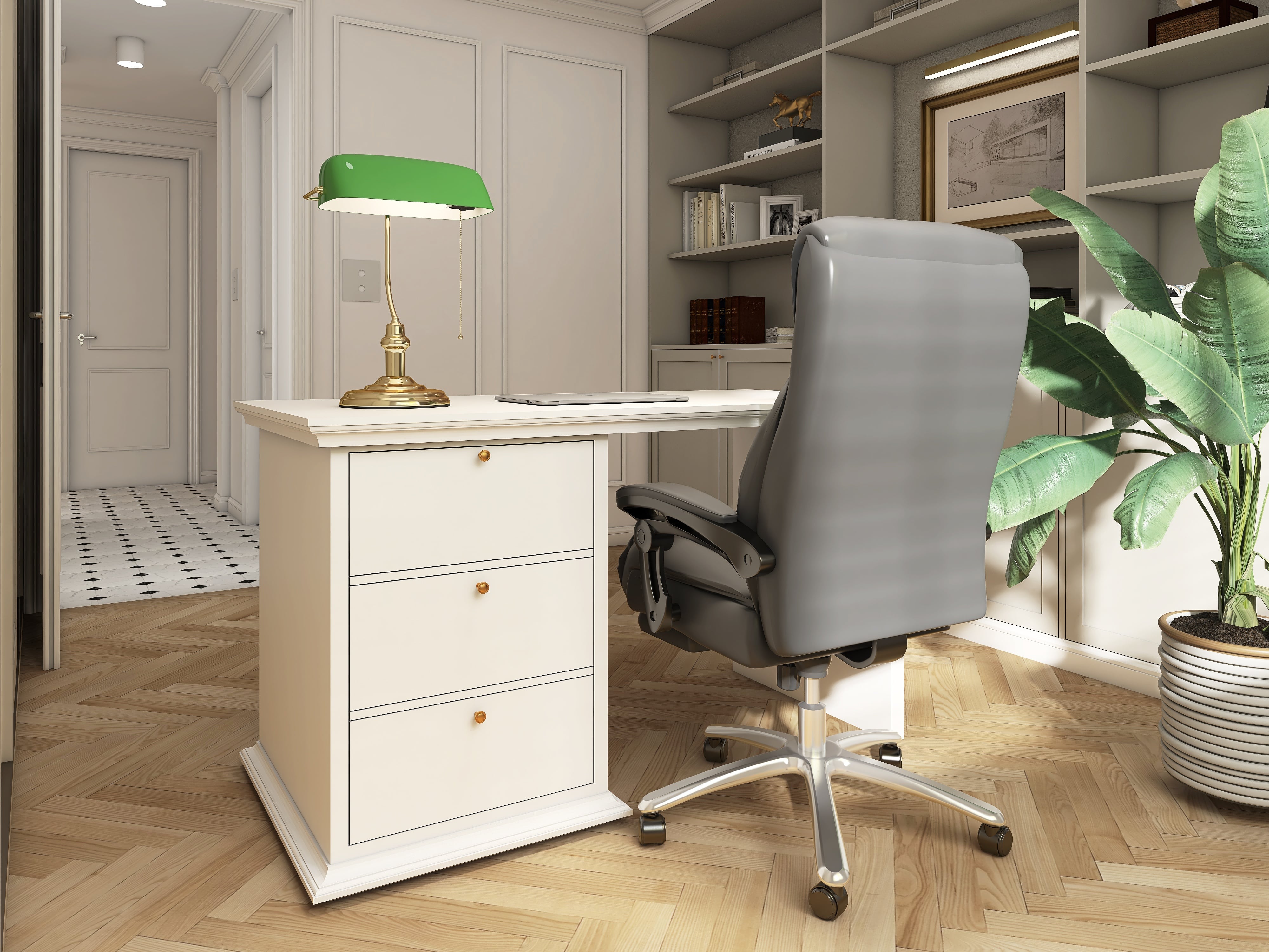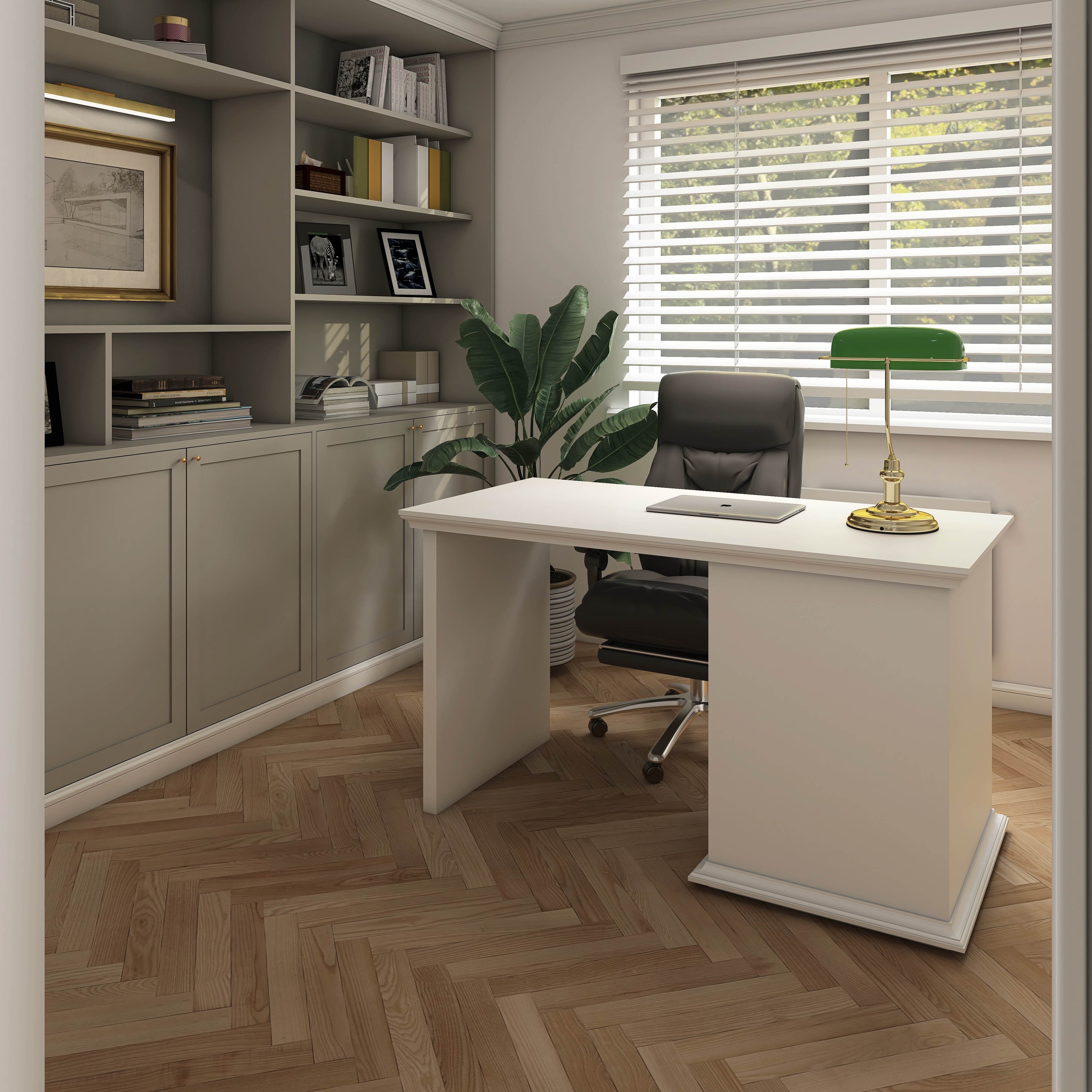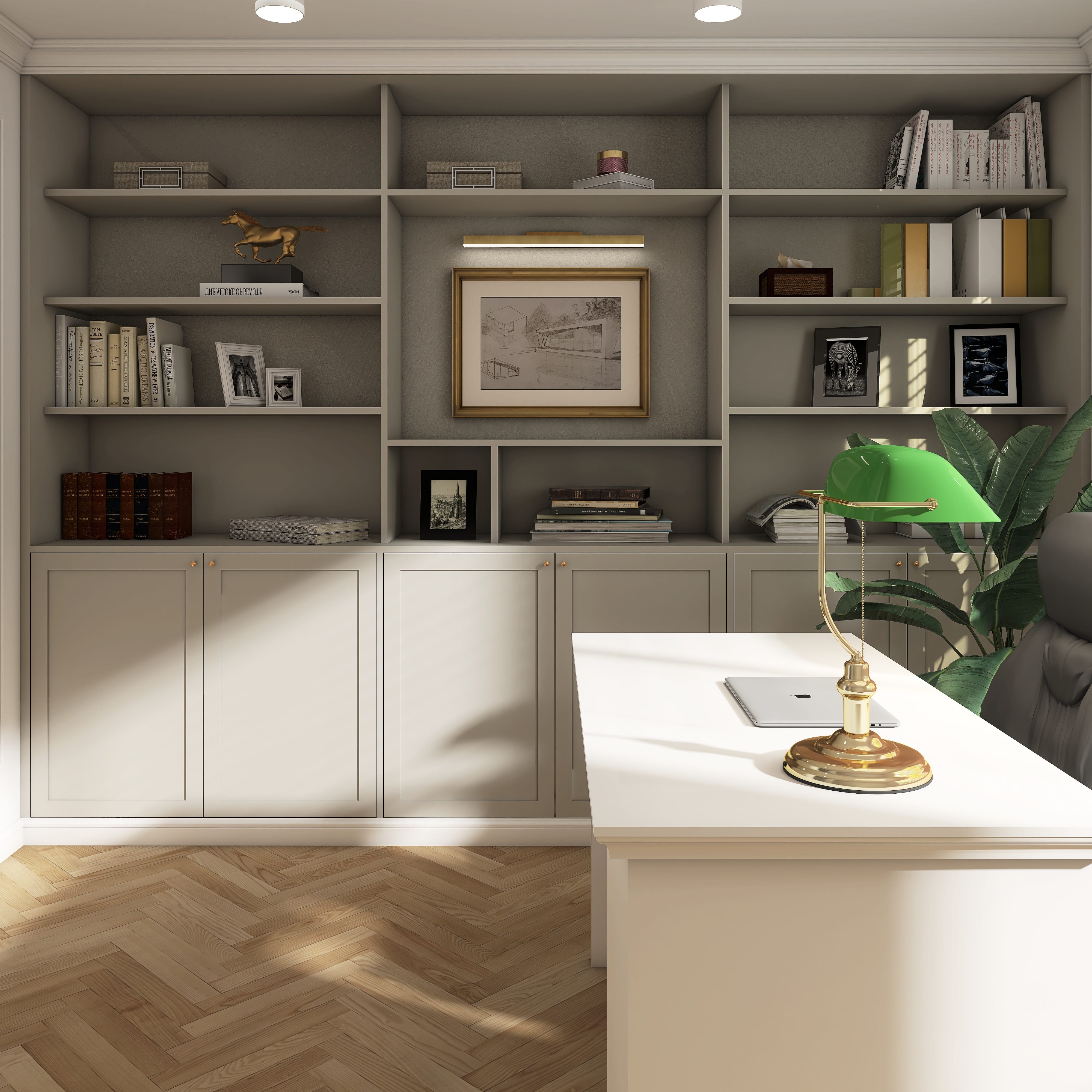 Szary regał na książki nie tylko pełni funkcję praktyczną, ale także dodaje wnętrzu lekkości i stylu. Wnętrze ożywione białym biurkiem ze zdobieniami, tworzącym idealne miejsce do kreatywnej pracy. Sztukateria na ścianie dodaje szlachetności, a miejsce na obraz zaprasza do osobistego wyrazu w przestrzeni. Pracuj z elegancją, pracuj z klasą! 💼